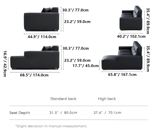 Domus Modular Black Leather Sofa Set features luxurious genuine leather upholstery and a sleek modern design. With its square appearance and thick padding, it offers a comfortable and stylish seating solution while also making a statement. Robust and durable, this luxurious sofa is built to withstand years of use.